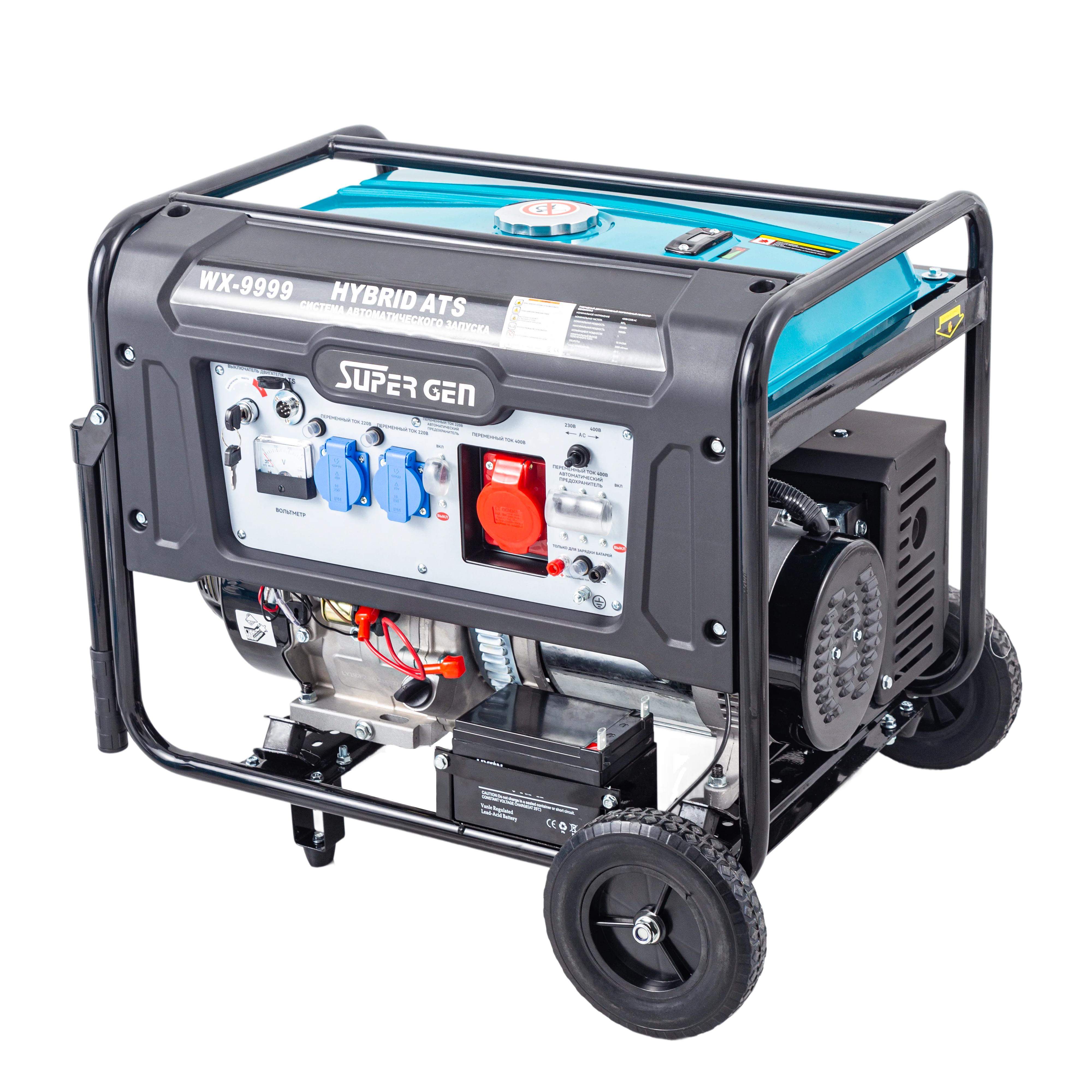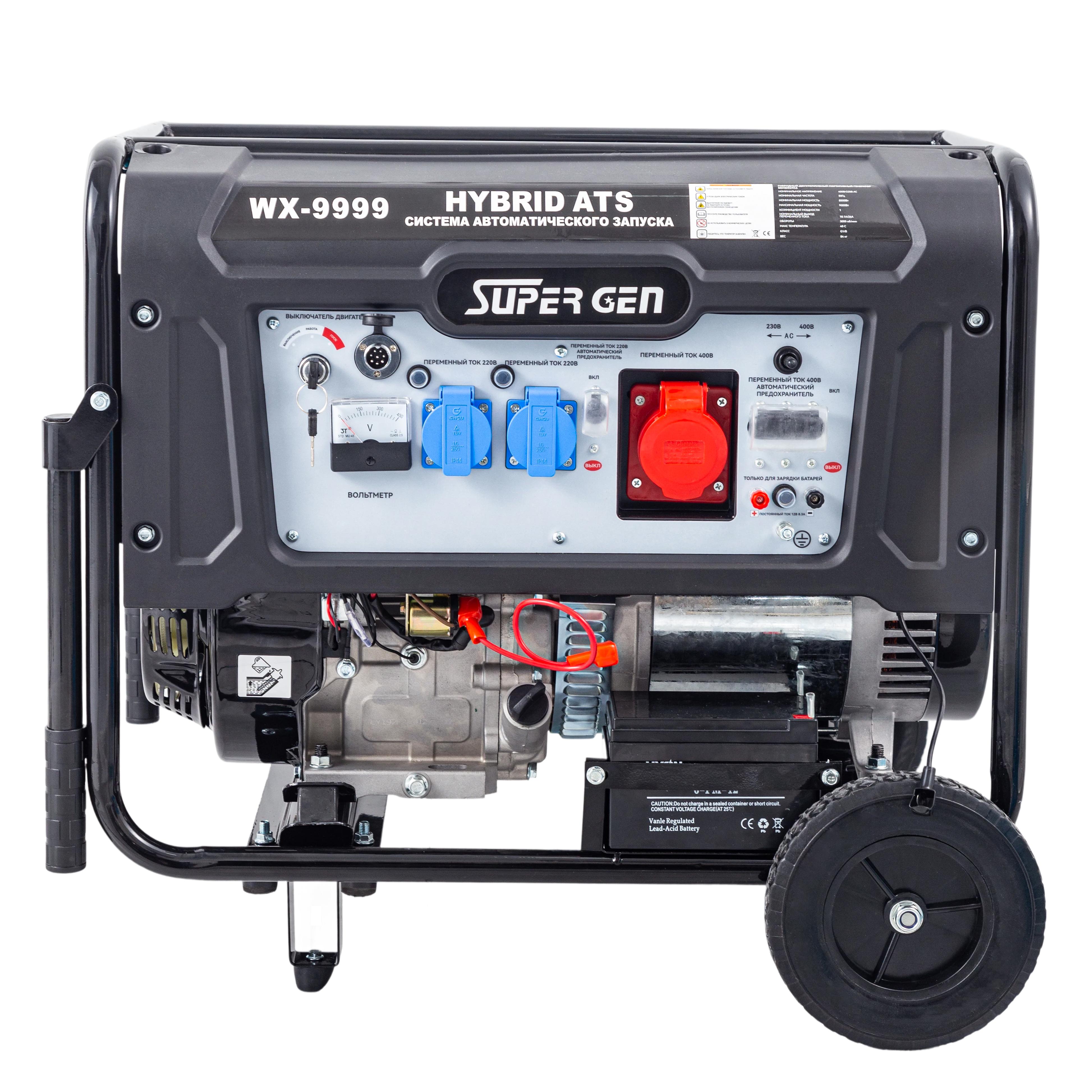 Генератор Super Gen WX-9999 ПУЛЬТ+ | Бензин 92/95 – ГАЗ (метан/пропан) | Система ATS Технические характеристики: 1. Мощность: • 8,5–9 кВт (220В/380В) • Выходной ток: 30,4 А • Двигатель: 4,58 л.с. 2. Параметры двигателя: • Модель: 192F2 • Расход топлива: 3,125 л/ч • Время работы на полном баке: 8 часов • Топливный бак: 25 л • Масляный бак: 1,1 л 3. Физические характеристики: • Вес без упаковки: 90,25 кг • Вес в упаковке: 97,4 кг • Размеры без упаковки (Д×Ш×В): 73×54×56 см • Размеры в упаковке (Д×Ш×В): 74,5×55×57 см 4. Дополнительные опции: • Двухтопливный: работает на бензине 92/95 или на газе (метан/пропан) • Система ATS (автоматический запуск при отключении электроэнергии/система аварийного пуска) • Электростартер (ключ, пульт ДУ) • Ручной запуск • Розетки: 220V/380V/12V • Синхронный альтернатор • AVR-система • Медная обмотка • Частота вращения: 3000 об/мин • Охлаждение: вентиляторное • Материал корпуса: стальная рама, колеса, удобные ручки, качественный пластик • Уровень шума с 7 метров: 72 дБ • Модель свечи: F6RTC • Класс защиты: IP230M Доставка в любую точку России, оплата при получении.