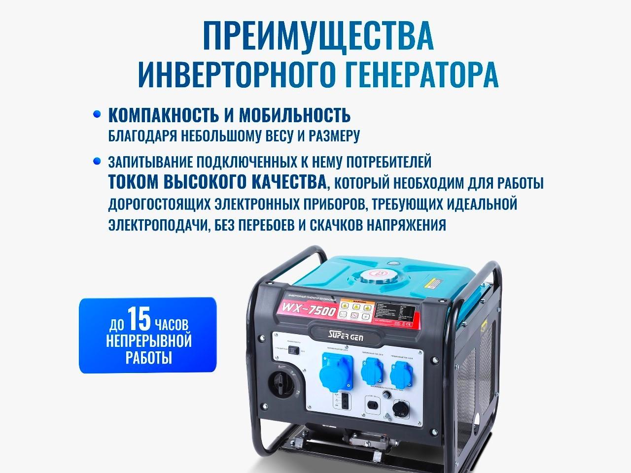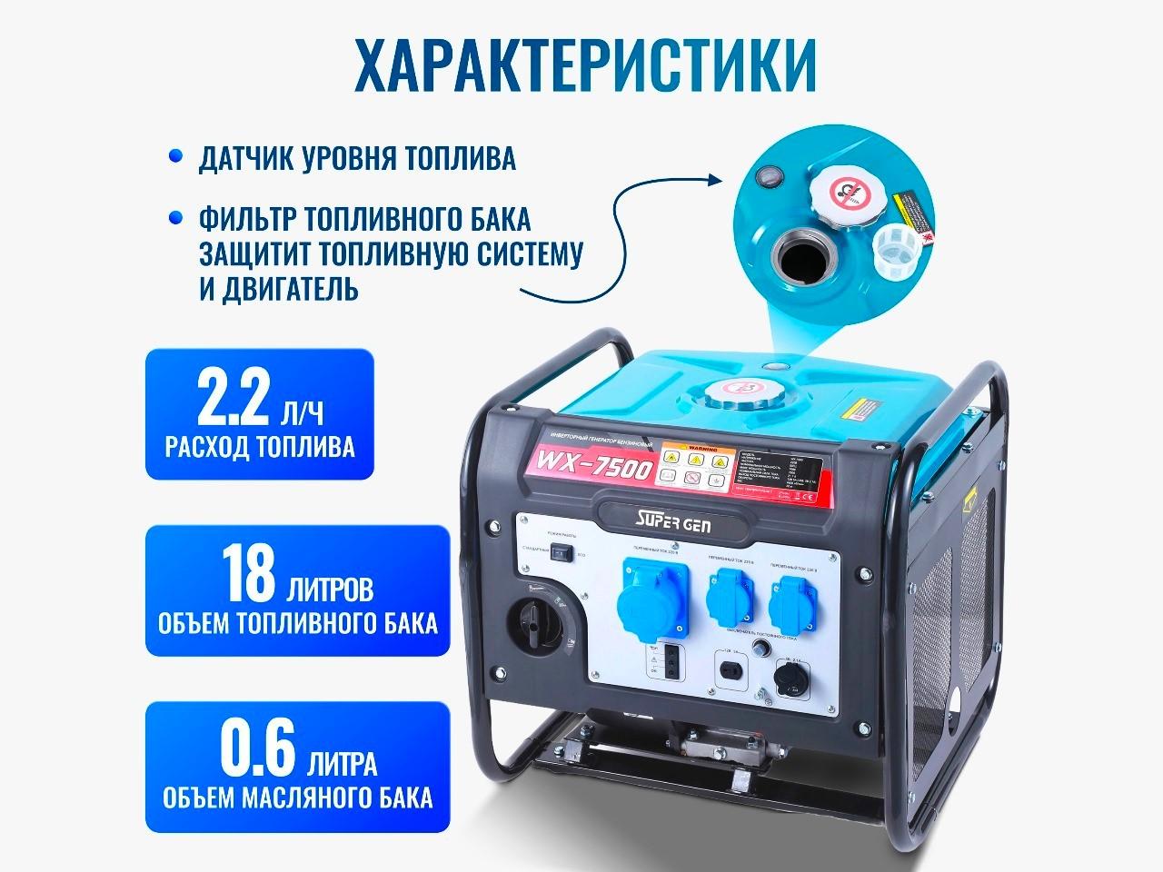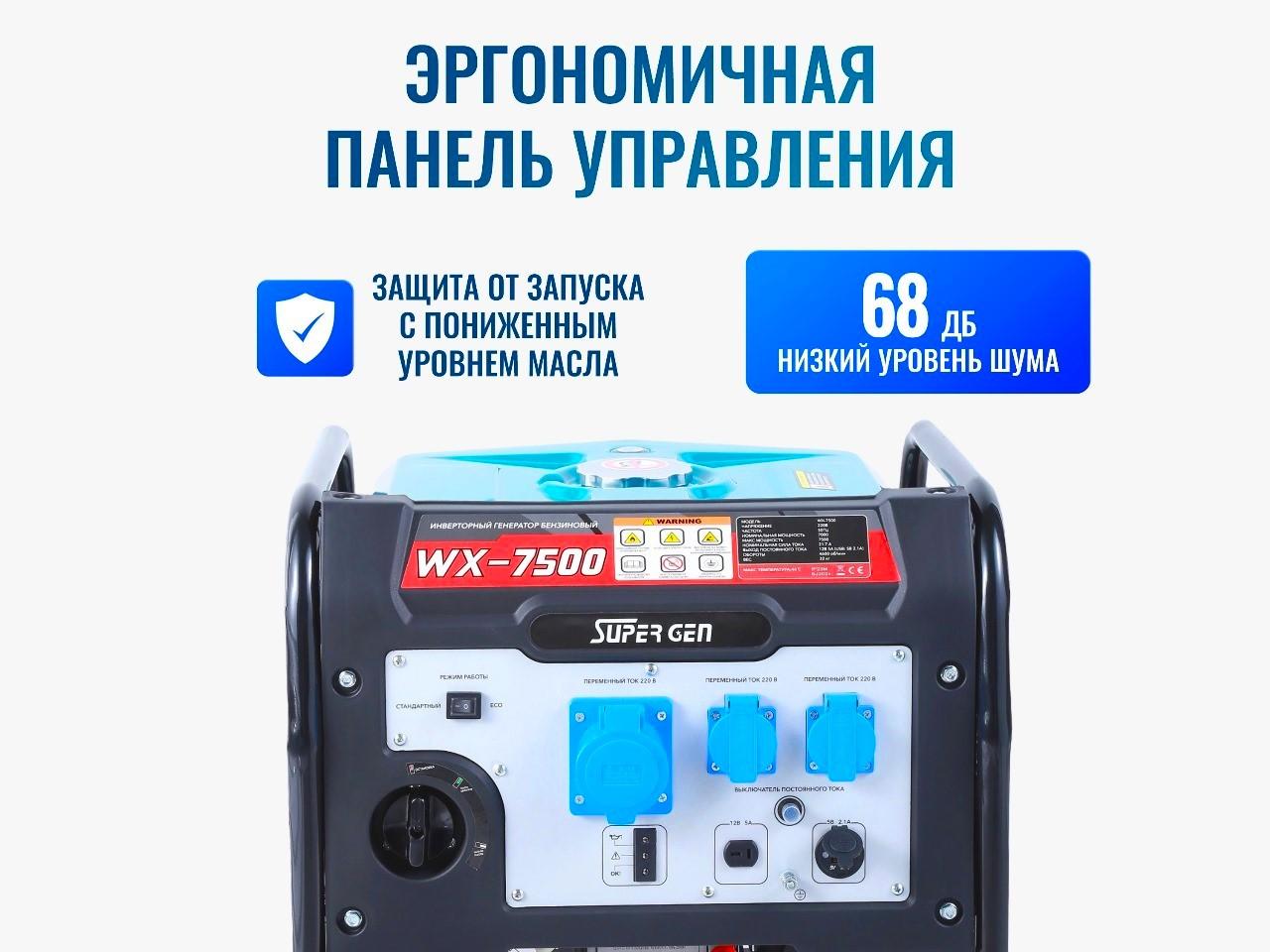 Генератор инверторный Super Gen WX-7500 бензин 92-95 Технические характеристики: 1. Мощность: - 7,5 кВт (220В) - выходной ток 20,4 А - Двигатель 3,58 л.с. 2. Параметры двигателя: - Модель: 162F2 - Расход топлива: 2.125 л/ч - Время работы на полном баке: 12 часов - Объем топливного бака: 18 л - Объем масляного бака: 0,6 л 3. Физические характеристики: - Вес без упаковки: 32 кг - Вес в упаковке: 35,25 кг - Размеры (ДхШхВ): 56*54*54 см 4. Дополнительные опции: - Работает на бензине - Ручной запуск - Розетки 220V/12V - Синхронный альтернатор - AVR-система - Медная обмотка - Частота вращения: 3000 об/мин Преимущества генератора: • Современная инверторная технология формирует чистую синусоиду без искажений, что позволяет безопасно подключать чувствительную электронику: компьютеры, медицинские приборы и другое оборудование. • Системы защиты от перегрузок и коротких замыканий обеспечивают стабильную и безопасную работу устройства. • Лёгкая и компактная конструкция облегчает транспортировку и хранение генератора. • Надежный четырехтактный верхнеклапанный одноцилиндровый двигатель гарантирует бесперебойную и устойчивую работу. • Экономичный расход топлива позволяет использовать генератор без частых дозаправок — до 15 часов непрерывной работы на одной заправке. • Прочный металлический корпус с системой шумоподавления и антивибрационными опорами снижает уровень шума до 68 дБ, делая эксплуатацию более комфортной. • Индикатор уровня масла своевременно сообщает о необходимости доливки, а система защиты не позволит запустить двигатель при недостаточном уровне масла, предотвращая поломки. • Универсальность использования: три розетки на 220 В, выходы на 12 В и USB 5 В, а также клеммы для зарядки устройств входят в комплект. • Простота управления позволяет быстро освоить работу с генератором даже тем, кто ранее не имел подобного опыта.