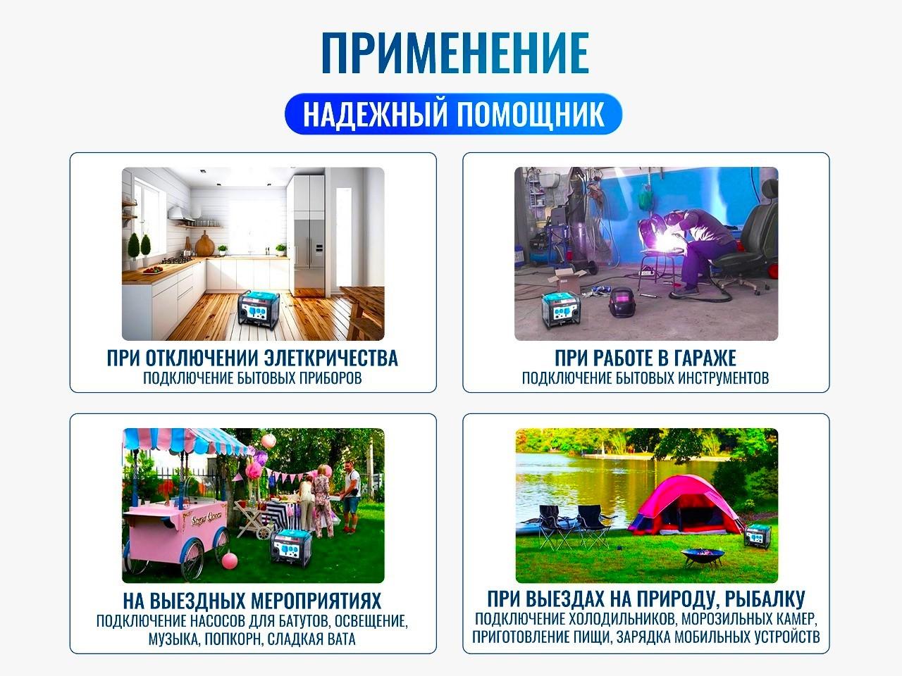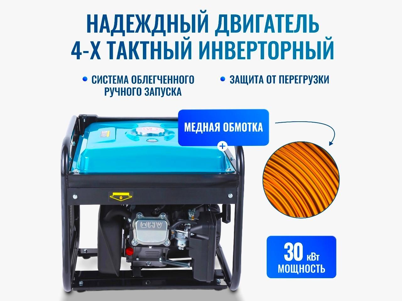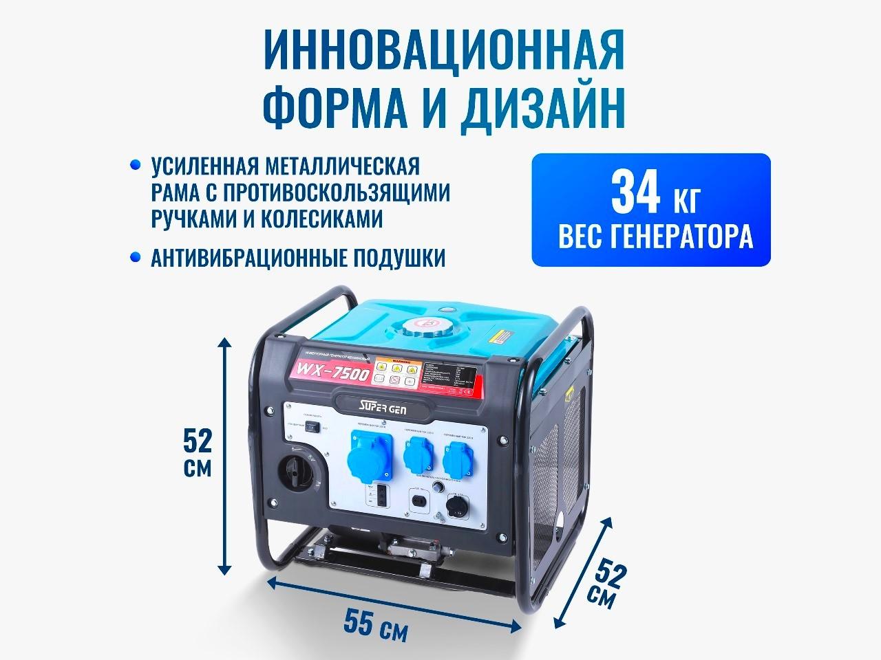 Генератор инверторный Super Gen WX-7500 бензин 92-95 Технические характеристики: 1. Мощность: - 7,5 кВт (220В) - выходной ток 20,4 А - Двигатель 3,58 л.с. 2. Параметры двигателя: - Модель: 162F2 - Расход топлива: 2.125 л/ч - Время работы на полном баке: 12 часов - Объем топливного бака: 18 л - Объем масляного бака: 0,6 л 3. Физические характеристики: - Вес без упаковки: 32 кг - Вес в упаковке: 35,25 кг - Размеры (ДхШхВ): 56*54*54 см 4. Дополнительные опции: - Работает на бензине - Ручной запуск - Розетки 220V/12V - Синхронный альтернатор - AVR-система - Медная обмотка - Частота вращения: 3000 об/мин Преимущества генератора: • Современная инверторная технология формирует чистую синусоиду без искажений, что позволяет безопасно подключать чувствительную электронику: компьютеры, медицинские приборы и другое оборудование. • Системы защиты от перегрузок и коротких замыканий обеспечивают стабильную и безопасную работу устройства. • Лёгкая и компактная конструкция облегчает транспортировку и хранение генератора. • Надежный четырехтактный верхнеклапанный одноцилиндровый двигатель гарантирует бесперебойную и устойчивую работу. • Экономичный расход топлива позволяет использовать генератор без частых дозаправок — до 15 часов непрерывной работы на одной заправке. • Прочный металлический корпус с системой шумоподавления и антивибрационными опорами снижает уровень шума до 68 дБ, делая эксплуатацию более комфортной. • Индикатор уровня масла своевременно сообщает о необходимости доливки, а система защиты не позволит запустить двигатель при недостаточном уровне масла, предотвращая поломки. • Универсальность использования: три розетки на 220 В, выходы на 12 В и USB 5 В, а также клеммы для зарядки устройств входят в комплект. • Простота управления позволяет быстро освоить работу с генератором даже тем, кто ранее не имел подобного опыта.